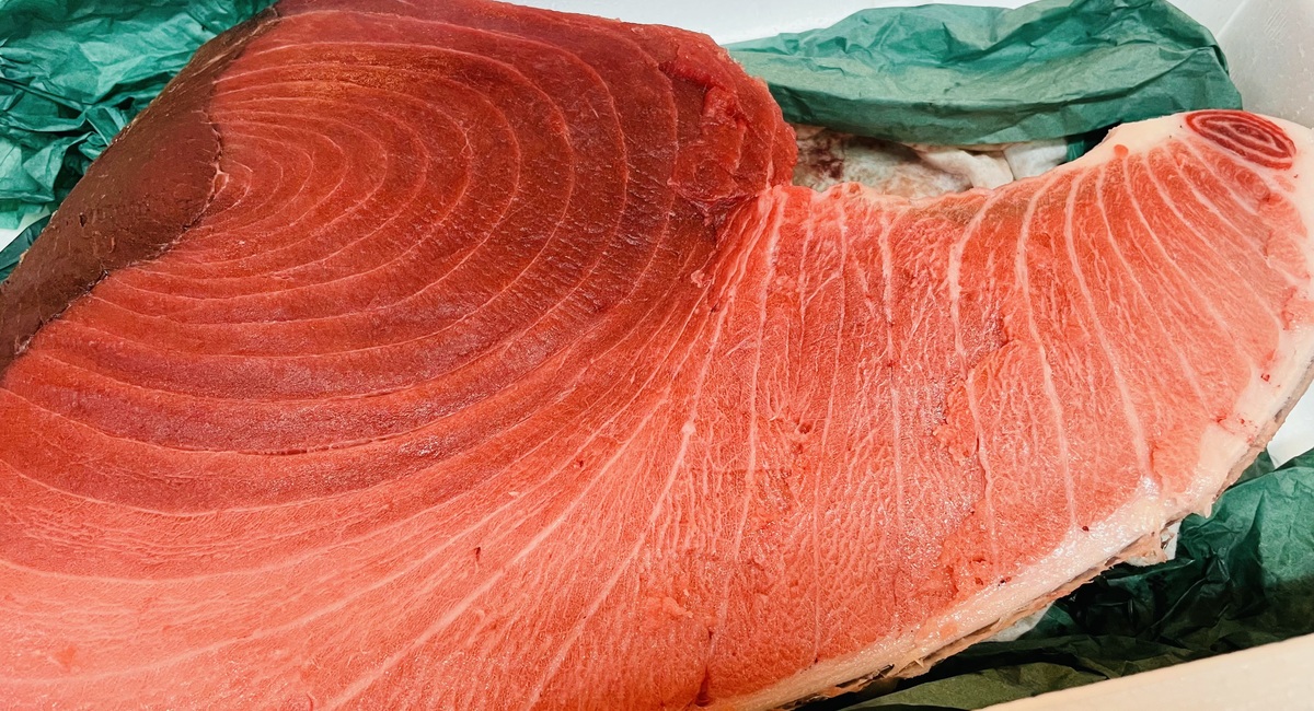 260kgの大物、腹側の脂のあるところですが赤身も最高です。